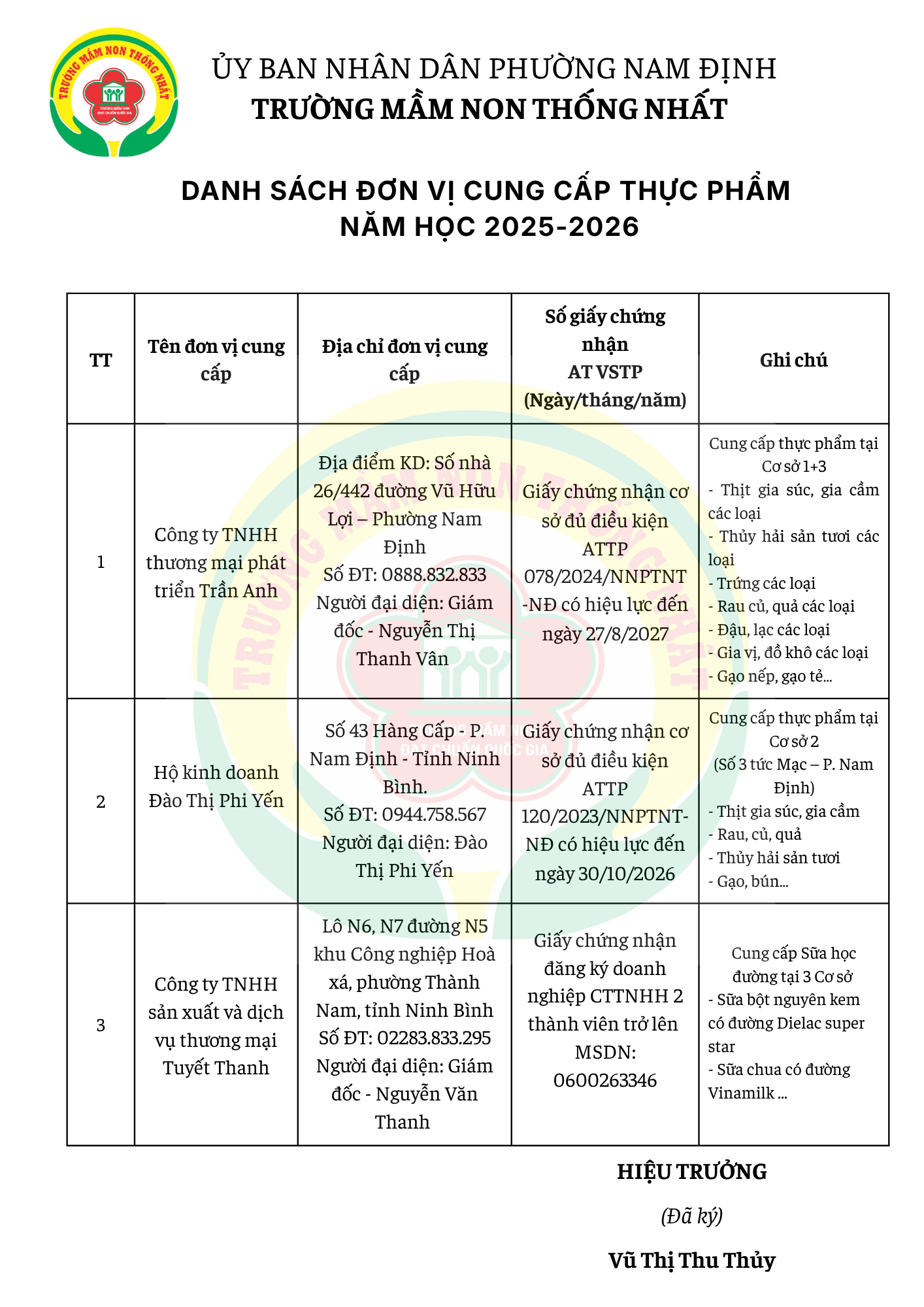 📢 Nhằm tăng cường tính minh bạch, đồng thời tạo sự phối hợp chặt chẽ với phụ huynh trong công tác giám sát bữa ăn bán trú, nhà trường trân trọng công khai danh sách các đơn vị cung cấp thực phẩm năm học 2025 – 2026.