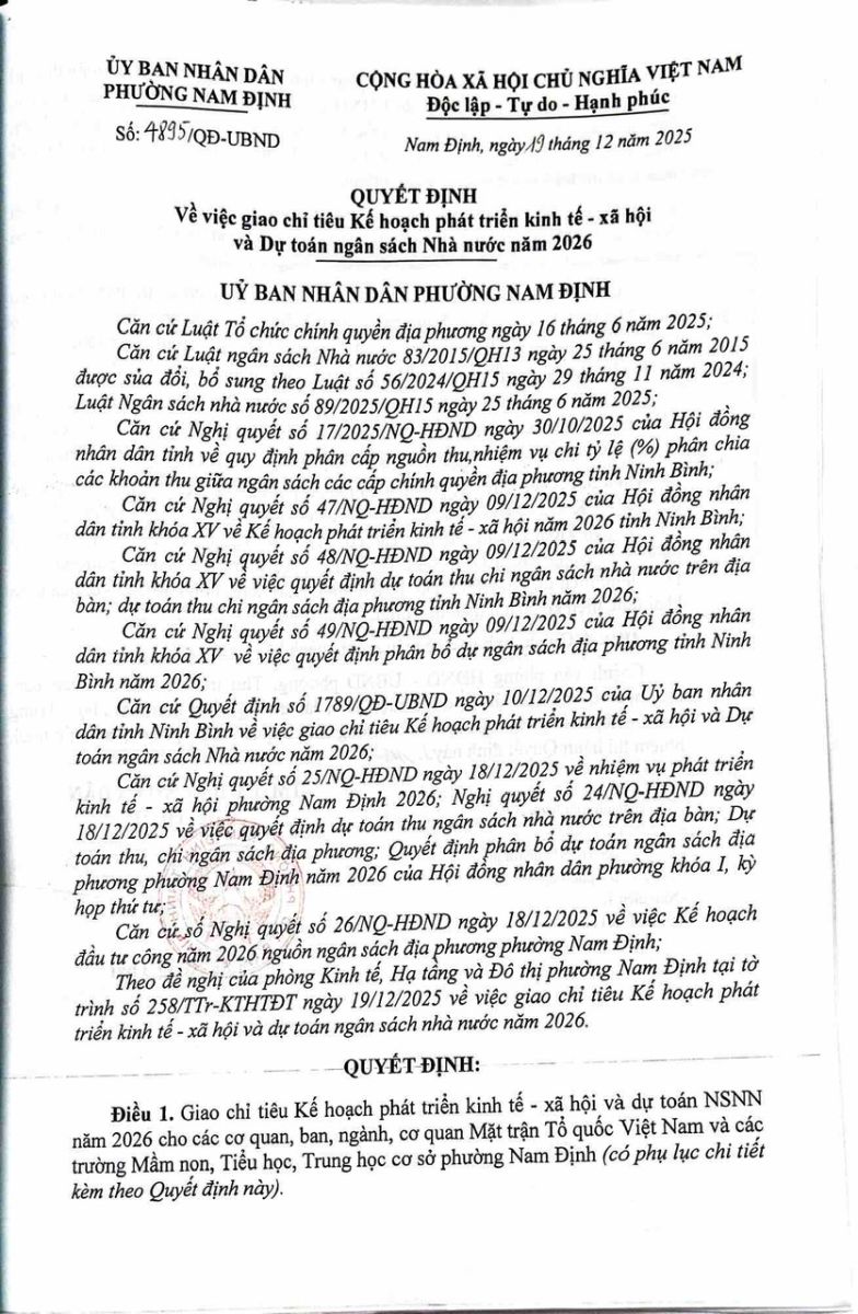 Về việc giao chỉ tiêu Kế hoạch phát triển kinh tế – xã hội và dự toán ngân sách Nhà nước năm 2026